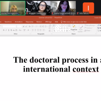ასევე, ნათია გეგელაშვილმა, რომელიც არის განათლების მეცნიერებების სადოქტორო პროგრამის სტუდენტი და წარმომადგენლობითი საბჭოს წევრი, მსმენელებს გაუზიარა საკუთარი გამოცდილება და წარუდგინა პრეზენტაცია თემაზე: EEU PHD Student Research Journey