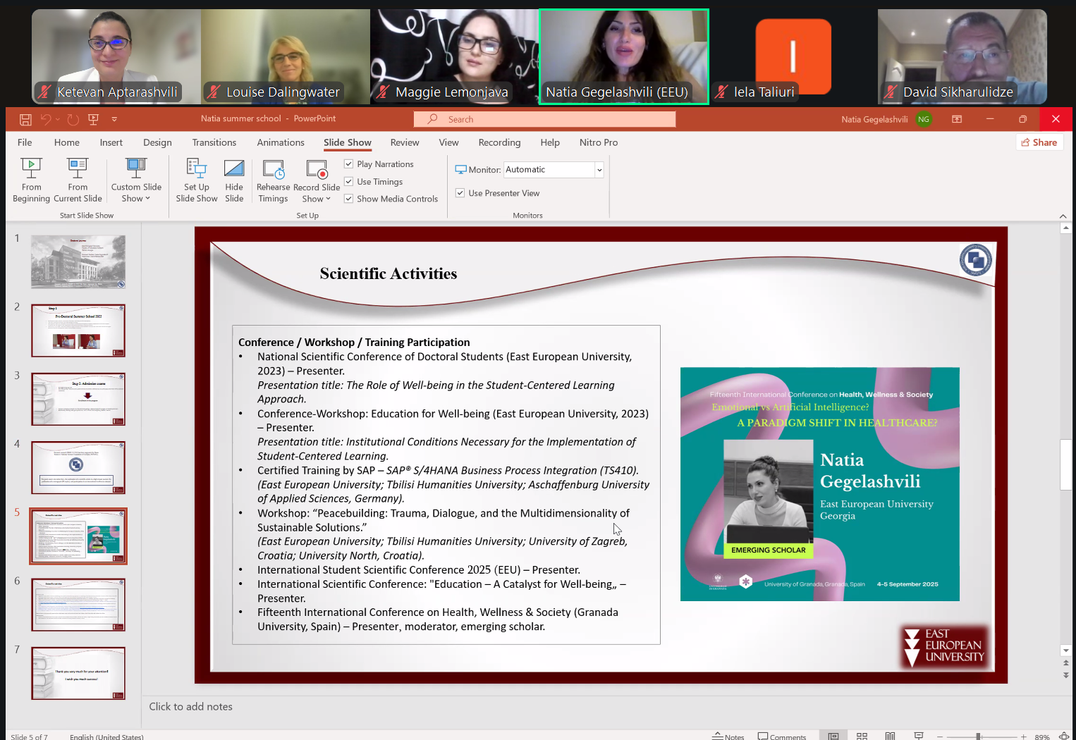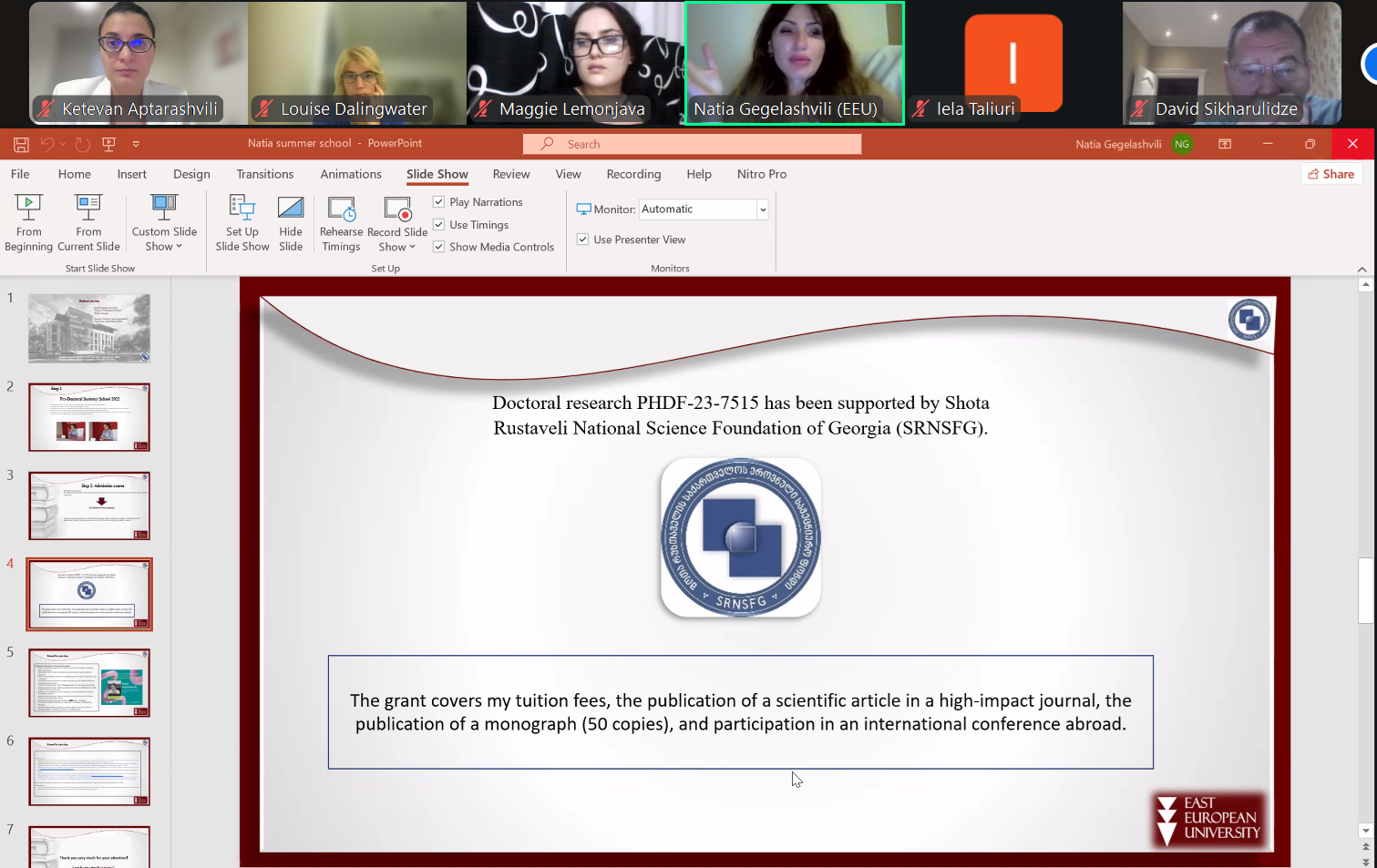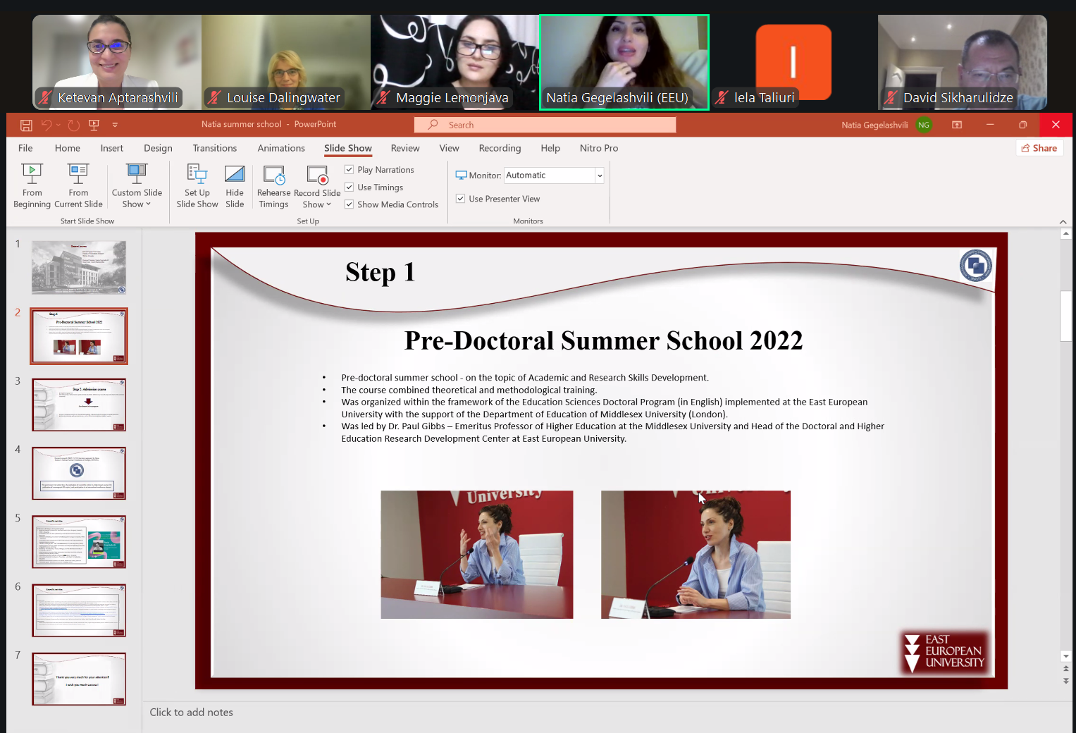 ასევე, ნათია გეგელაშვილმა, რომელიც არის განათლების მეცნიერებების სადოქტორო პროგრამის სტუდენტი და წარმომადგენლობითი საბჭოს წევრი, მსმენელებს გაუზიარა საკუთარი გამოცდილება და წარუდგინა პრეზენტაცია თემაზე: EEU PHD Student Research Journey