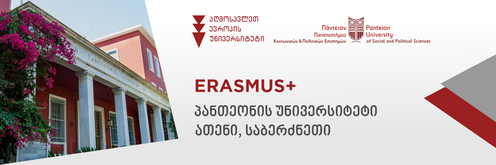 აღმოსავლეთ ევროპის უნივერსიტეტი აცხადებს კონკურსს სტუდენტებისთვის, 2025-2026 სასწავლო წლის გაზაფხულის სემესტრში (გაზაფხულის სემესტრი მოიცავს შემდეგ პერიოდს: 23 თებერვალი 2026 – 5 ივნისი 2026) პანთეონის სოციალურ და პოლიტიკურ მეცნიერებათა უნივერსიტეტში (საბერძნეთი) Erasmus+ გაცვლით პროგრამაში მონაწილეობისთვის.