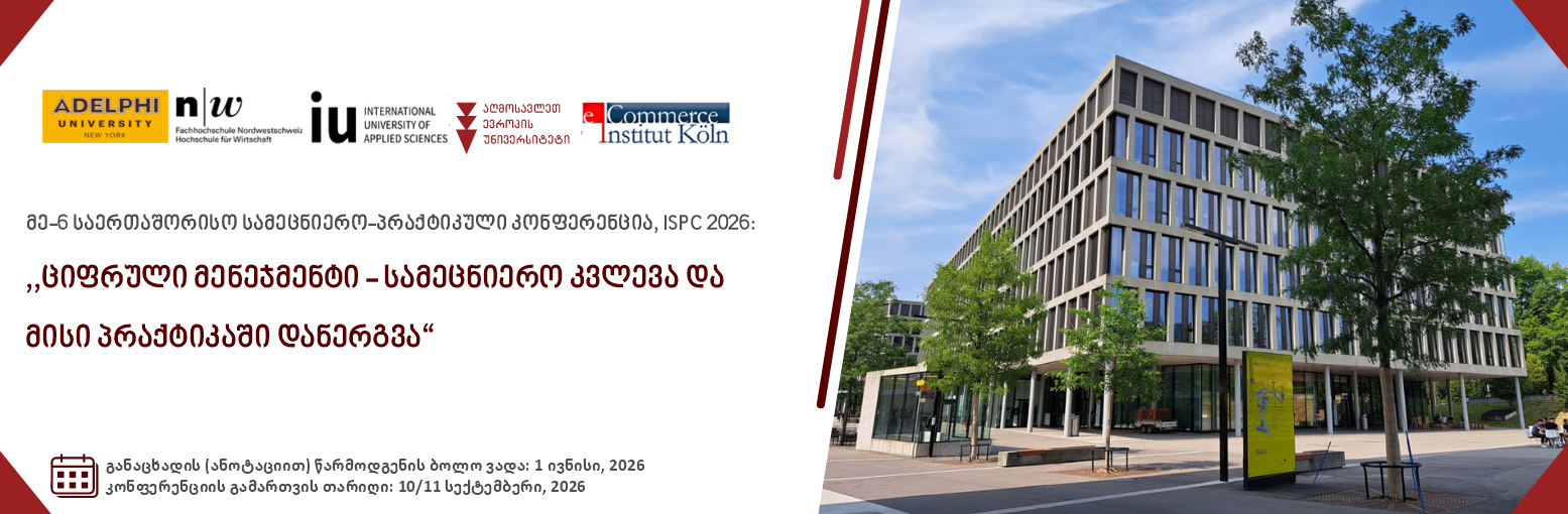 აღმოსავლეთ ევროპის უნივერსიტეტი (EEU) (თბილისი, საქართველო), ჩრდილო-დასავლეთ შვეიცარიის გამოყენებითი მეცნიერებებისა და ხელოვნების უნივერსიტეტთან (FHNW) (ბრიუგი, შვეიცარია), გამოყენებითი მეცნიერებების საერთაშორისო უნივერსიტეტთან (IU) (კიოლნი, გერმანია), ელექტრონული კომერციის ინსტიტუტთან (ECI) (კიოლნი, გერმანია) და ადელფის უნივერსიტეტთან (AU) (ნიუ-იორკი, აშშ) პარტნიორობით 2026 წლის 10-11 სექტემბერს მართავს რიგით მე-6 წლიურ საერთაშორისო სამეცნიერო-პრაქტიკულ კონფერენციას ISPC 2026: ,,ციფრული მენეჯმენტი – სამეცნიერო კვლევა და მისი პრაქტიკაში დანერგვა.“