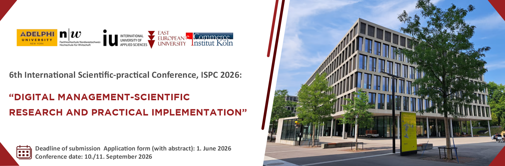 East European University (EEU, Tbilisi, Georgia), in partnership with the University of Applied Sciences and Arts Northwestern Switzerland (FHNW, Brugg, Switzerland), International University of Applied Sciences (IU, Cologne, Germany), E-Commerce Institute (ECI, Cologne, Germany), and Adelphi University (AU, New York, USA), will organize the 6th Annual International Scientific-Practical Conference – ISPC 2026 on September 10–11, 2026, titled: “Digital Management – Scientific Research and Its Practical Implementation.”