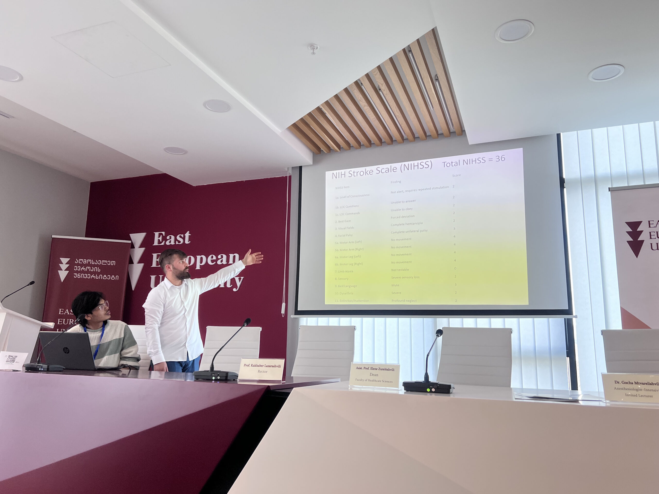 ღონისძიების მთავარმა მომხსენებელმა გოჩა მთვარელიშვილმა (ანესთეზიოლოგ-რეანიმატოლოგი, ჯანდაცვის მეცნიერებათა ფაკულტეტის მოწვეული ლექტორი) აუდიტორიას ინსულტის დიაგნოსტიკაში ტვინის გამოსახულებითი კვლევების (CT/MRI) გამოყენებასა და სხვადასხვა ტიპის ინსულტის ამოცნობის თავისებურებებზე ესაუბრა და ინსულტის შემდგომ პაციენტის ნევროლოგიური გასინჯვის NIH Stroke Scale-ის გამოყენებით პრატიკული სიმულაცია ჩაუტარა.