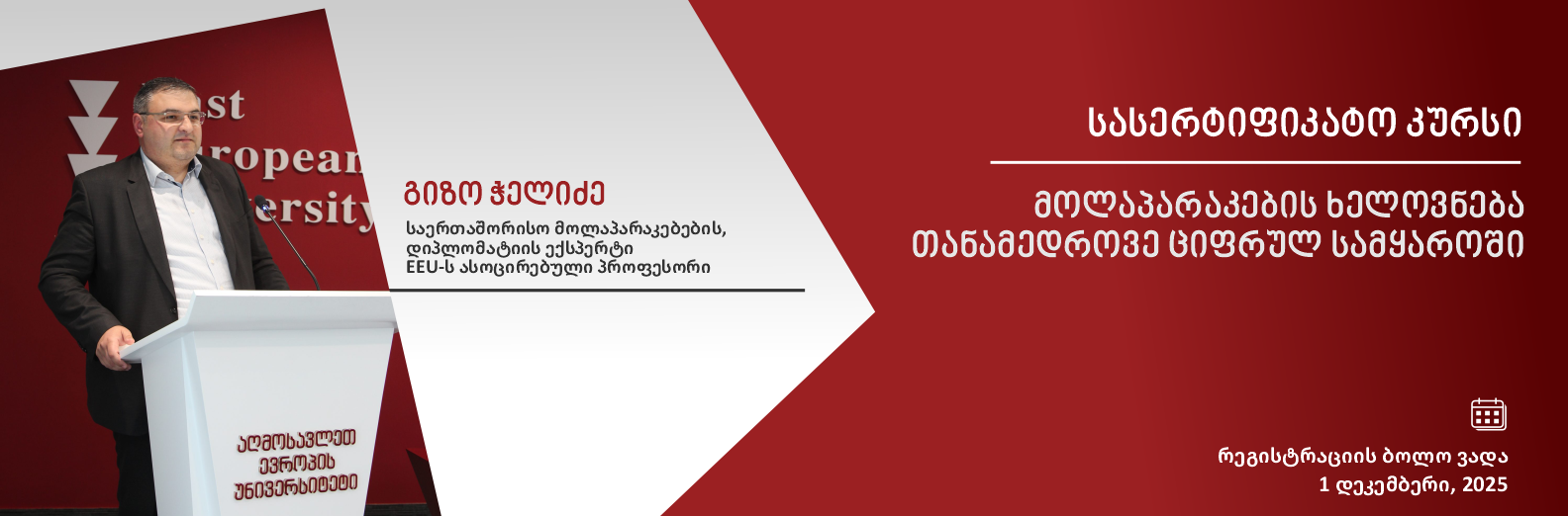 აღმოსავლეთ ევროპის უნივერსიტეტის (EEU) უწყვეტი განათლებისა და სტუდენტური სერვისების ცენტრი ნებისმიერი დაინტერესებული პირისთვის აცხადებს მიღებას სასერტიფიკატო კურსზე – ,,მოლაპარაკების ხელოვნება თანამედროვე ციფრულ სამყაროში’’.