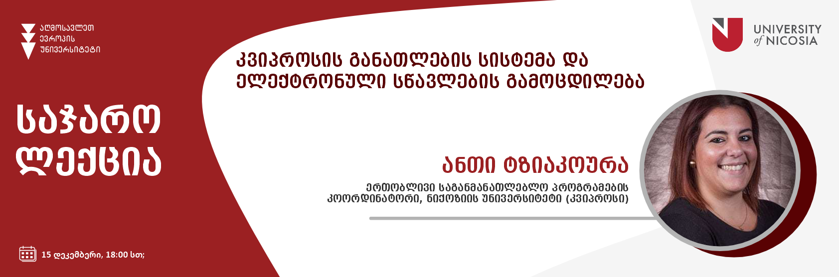 EEU-სა და ნიქოზიის უნივერსიტეტის ერთობლივი ინიციატივით, 15 დეკემბერს, 18:00 საათზე, საკონფერენციო დარბაზში (201), გაიმართება საჯარო ლექცია თემაზე „კვიპროსის განათლების სისტემა და ელექტრონული სწავლების გამოცდილება“.